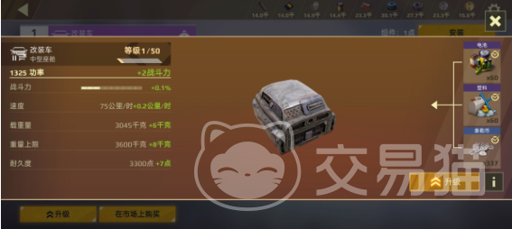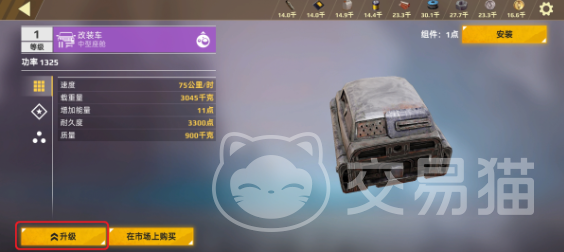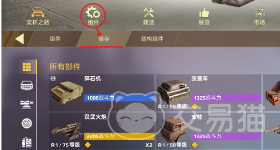 玩家在进入到车库的主界面时,只需要点击组件按钮,就可看到储存页面进入到仓库中,这里会有一个小黄点,这意味着需要升级。玩家可以通过改装车进入属性展示的界面,左下角还有一个升级的按钮,只需要点击之后就可以升。