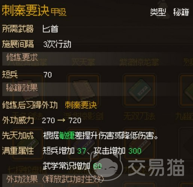 虽然整个获得过程看似繁琐且充满随机性,但刺秦要诀的强大之处绝对值得这些努力。作为一套甲级武学,它不仅在攻击力上极为出众,而且匕首的快速出招与精准打击更是让敌人防不胜防。尤其是在面对单个敌人时,刺秦要诀的强大爆发力更是无可匹敌。