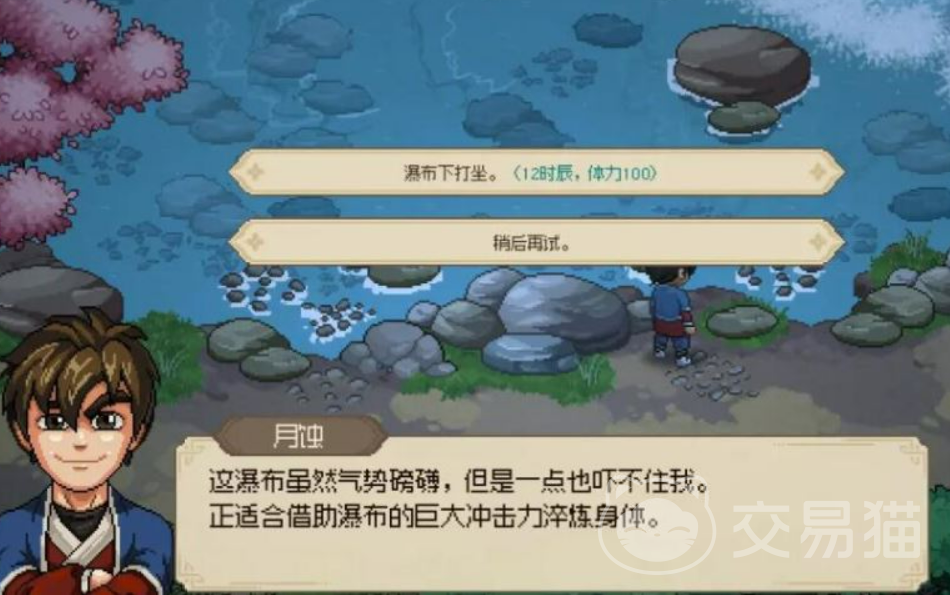 进入飞瀑潭后,你会发现这是一个乙级钓鱼点,但我们的目标并不是钓鱼,而是在此地进行修行。此时,你需要消耗12个时辰和100点体力在瀑布下打坐。值得注意的是,修行的过程并不是一蹴而就的,你可能需要多次尝试才能触发关键事件。