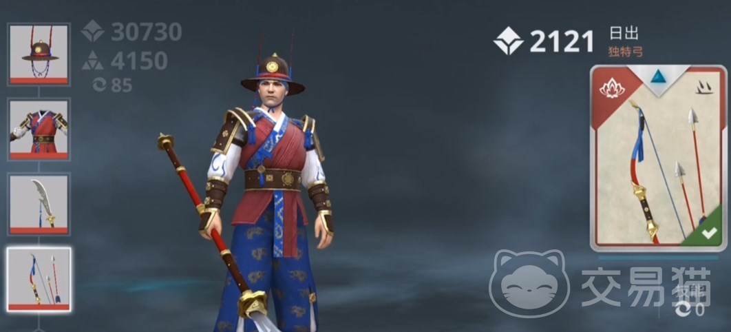 这款套装包含了一把关刀“神圣帝国”、一副盔甲“君王”、一个头盔“皇家护卫”以及一把弓箭“日出”。重点是要介绍下这把武器,属于王朝派系,有3个技能槽和1个特殊技能槽,拥有旋转暗影能力。
