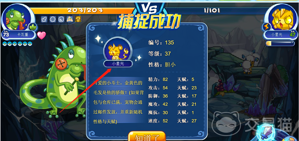 在洛克王国这款游戏中,小星光的造型也是非常生动可爱的,拥有金黄色的毛发,整体看上去高贵不可侵犯,在不断的升级进化之后,更是非常的威风,十分的帅气,如果玩家们想要获得这个宠物,可以在雷雨走廊中来进行捕捉,捕捉的等级是一星半,这个是雷霆峡谷中的野生怪,后续小星光30级之后就会进化成星光狮,玩家们可以捕捉到的小星光宠物应该都在30级以上,想要成功的进行捕捉,可以来到小星光的地图中,然后点击图中的小星光与他进行战斗。