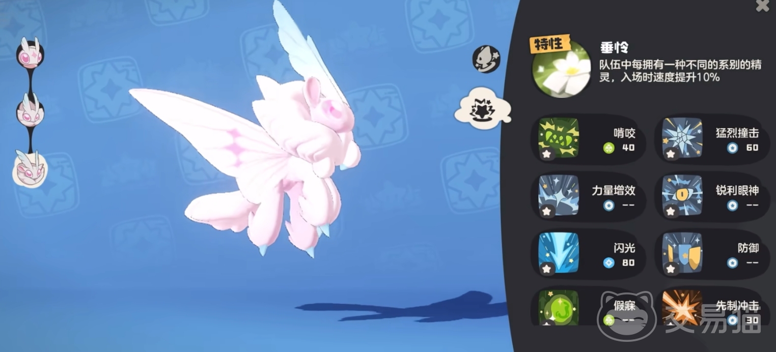 然后说下绒仙子这个精灵。这个精灵自带的特性名为垂怜。自身效果是依据队伍中精灵种类的多少提升精灵速度。然后技能逆光伤害很不错,并且玩家所带的精灵种类越多,技能为例也就越大。技能闪光也很不错,自身80的输出伤害,还有假寐这样的能量回复技能,整体强度很不错。