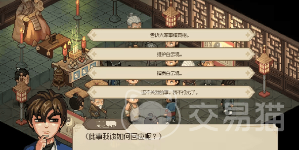 第一个选项是告诉大家事情的真相,选择这个会让玩家直接去和道士对打,注意道士有68级,玩家需要确保能打过才能选择这个选项,打完道士后玩家会和他的关系下降144点,回去交任务后名声能增加70点,与馆主的关系加10点,和白云观关系加5点。