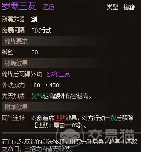 第二个选项是维护白云观,选择这个我们会获得秘籍岁寒三友,声望能加35点,和馆主关系加20点,和白云观的关系加10,注意需要声望达到6级才能直接摆平这个时间,如果不够后续就需要打官兵,但给的奖励会是一样的。