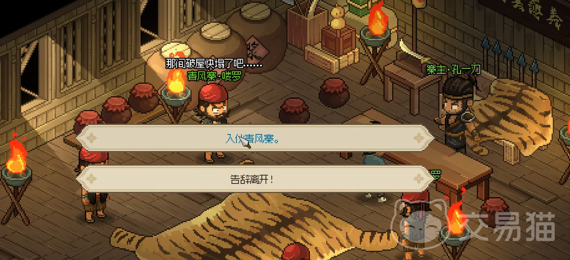 加入青风寨后,玩家将获得名声的提升以及一些实用的武器和技能,如丙级的柴刀刀法和乙级的青风令牌。此外,孔一刀作为青风寨的掌门,也是剧情的核心人物。他不仅可以通过切磋提升你的实战经验,还能在你与他关系达到一定程度后传授强力刀法,并可能成为你的队友。然而,这也伴随着潜在的危险,比如给孔一刀服用失心腐志丹虽然能一时获得强力助手,但也可能在十日后激怒他,导致关系急剧恶化,甚至触发新的战斗。