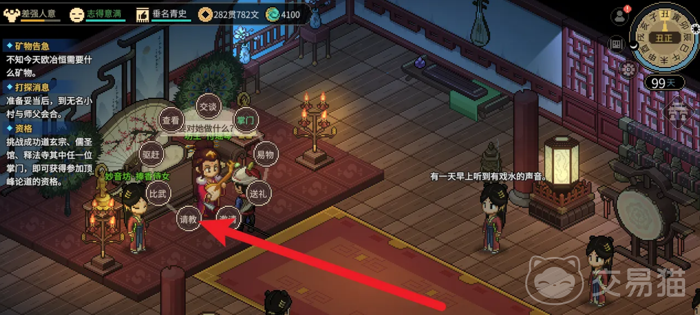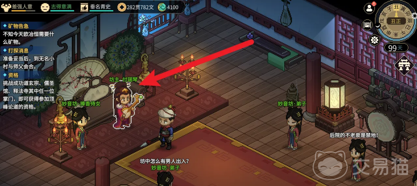 不过,这种方法有点繁琐。因此,另一种较为直接的方式是通过战斗来替换妙音坊的守门人,并利用特性——如皇室驸马或彬彬有礼——来与新守门人对话,从而快速提升妙音坊的关系值。虽然这种方式更为直接,但也需要你在提升门派关系的过程中谨慎行事,避免不必要的杀戮和纷争。
