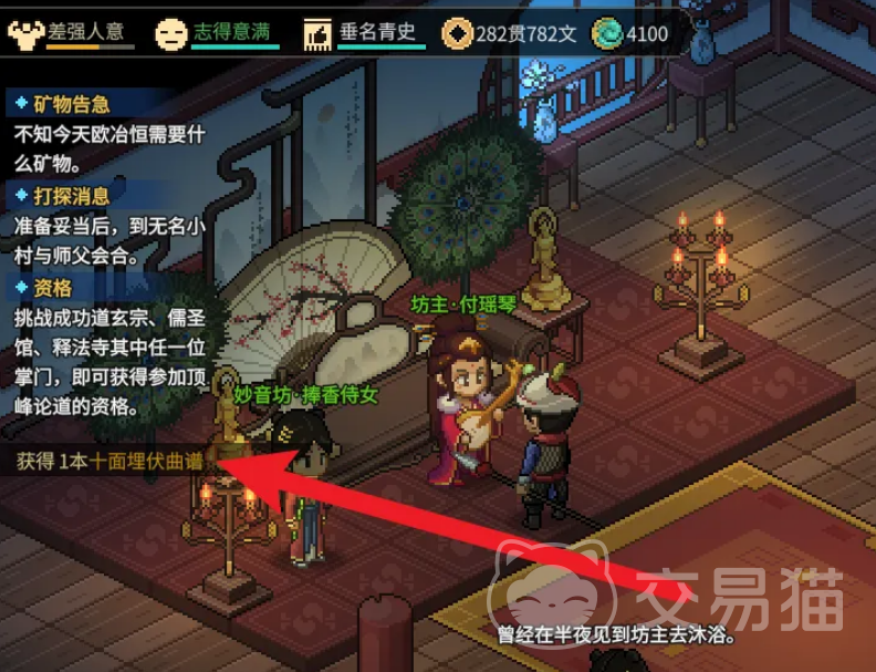 具体而言,你需要与妙音坊中的几位重要人物——付瑶琴、顾倾城和鱼薇儿——保持良好的关系。根据游戏的机制,只有当你与这三位角色的关系都达到100时,妙音坊整体的关系值才能突破80,这也是你能够向付瑶琴请教十面埋伏的必要条件。达成这个条件后,你可以通过与付瑶琴的对话来获取这份宝贵的曲谱。