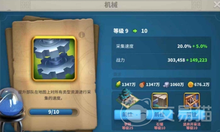 最后是科技机械,加快玩家资源采集速度的,可以快速搜集资源。铸币这种科技可千万不要点。这个说是提升金矿产量。但金矿想要获得大量金币就必须要升级,而升级所需的资源简直多的离谱。等升完以后,说不定敌人早就发展起来了。