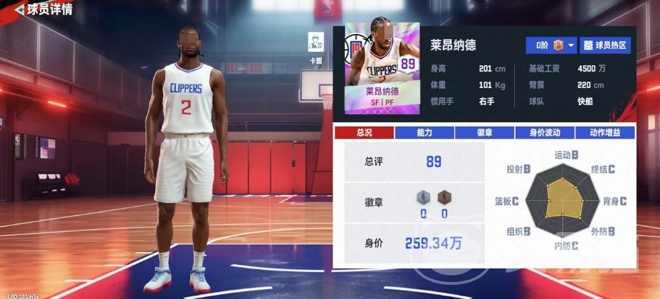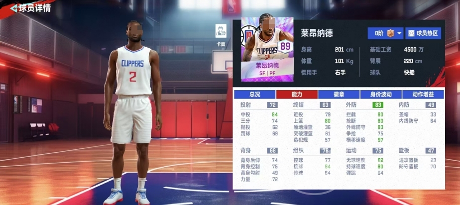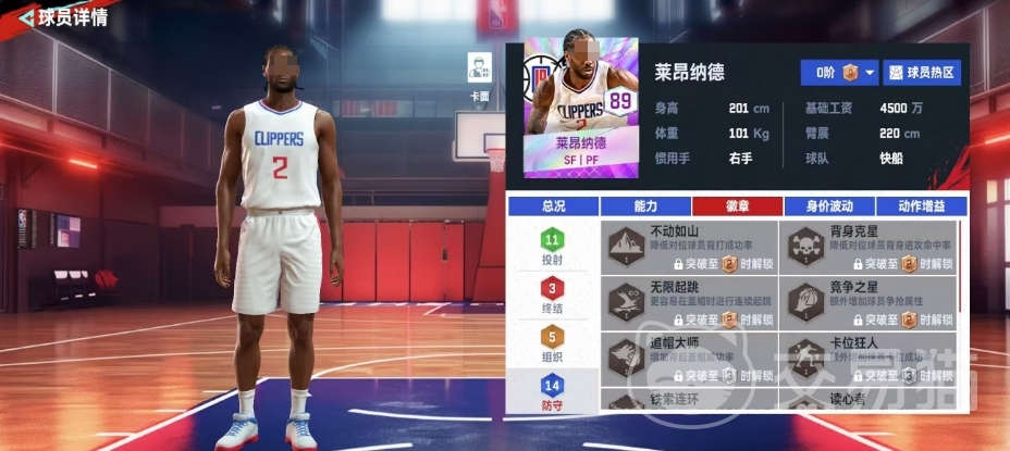 玩家可以通过合理运用他的强项,同时规避他的弱点,将莱昂纳德打造成球队中的关键人物,莱昂纳德的身高和臂展为他在游戏中的防守端提供了坚实的基础,他的身高达到201cm,臂展更是达到了惊人的220cm,作为快船队的一员也是效果不错的。