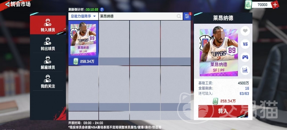 身价仅需259.34万即可在转会期间成功购入。同品质球员中还是不贵的,这样合理的价格使得他成为许多玩家考虑的对象,莱昂纳德的基础工资与同等级别的球员持平,为4500万,在基础属性方面,莱昂纳德的横移速度数值异常突出,高达97分,这样的横移速度在防守端能够有效地对抗对手的进攻,同时也能在进攻时快速改变位置,创造出更多的得分机会,此外他的接球属性也达到了94分,所以他在接应传球并完成得分方面拥有极高的能力。