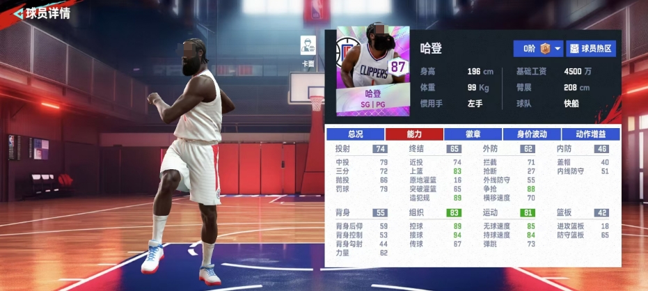 哈登他在紫色球员中的整体评分只有87分,这主要是因为他大部分的属性分数都比较均衡,没有过多的突出属性,然而正是这种均衡使得哈登在场上的表现更为全面,哈登的组织和运动类属性都达到了80多分,所以他在游戏中的处理球能力和移动能力都是相当不错的,他的基础属性中,接球能力尤为突出,达到了94分,这使得他在比赛中能够有效地完成接球动作,尤其是在运球阶段,这个优势可以被进一步放大。