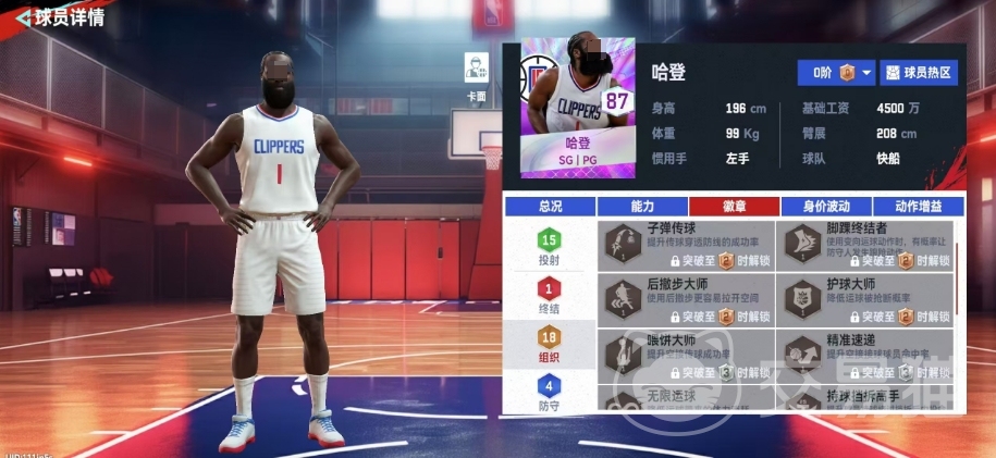 哈登的身高为196cm,臂展为208cm,虽然这样的身体条件在篮球运动员中并不罕见,但也为他提供了足够的条件在篮下完成得分或防守,由于他的整体属性评分并不算特别高,玩家在使用哈登时可能需要更多地依赖他的徽章技能效果来提升他在场上的表现,哈登所携带的徽章效果包括喂饼大师,这个徽章能够在他进行空接传球时提升传球的成功率,当他的徽章突破至3级时解锁,脚踝终结者徽章使得哈登在使用变向运球动作时,有概率让防守人员发生一些错误。