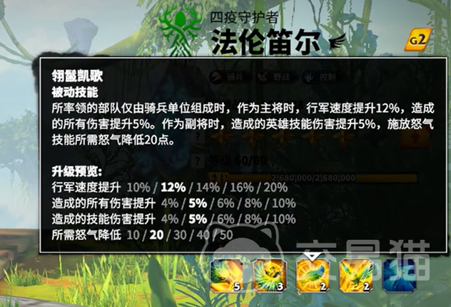 最后在技能升级方面,法伦笛尔的优先级顺序非常明确:一技能 > 三技能 > 二技能 > 四技能。尤其是一技能和三技能,无论是作为主将还是副将,都极其重要,可以为战斗带来显著的提升效果。此外,觉醒技能对法伦笛尔的战力提升非常大,因此非常值得玩家们投入资源进行提升。