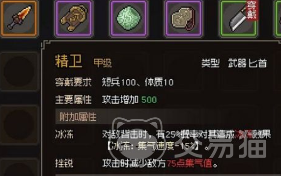 首先我们先简单的了解一下精卫这个装备的特性和能力,该装备主要的属性是能够为角色增加500的攻击力,并且附加属性上拥有冰冻效果,如果玩家背对敌人进行偷袭敌人进行击中时有25%的概率会对敌人造成冰冻效果。附加属性中在攻击时能够减少攻击的敌人75点的集气值效果。