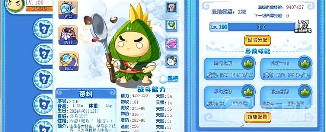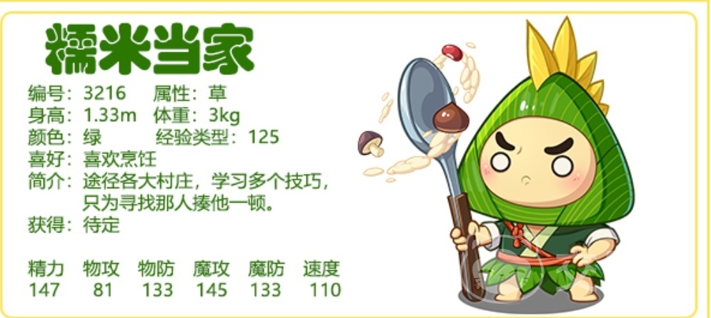 游戏中,糯米当家是一个草属性的魔攻魔物,后续可以进化成糯米头领,整体的颜色为绿色,可以学习各种技巧,比较推荐玩家们选择冷静的性格,可以更好的搭配他的技能来使用,其中沉着一击的魔法攻击,他的威力在120左右,速度越低,那么输出的威力就越大。在之前如果受到了伤害,会有暴击的效果,并且还可以删除对手本回合的技能2pp。