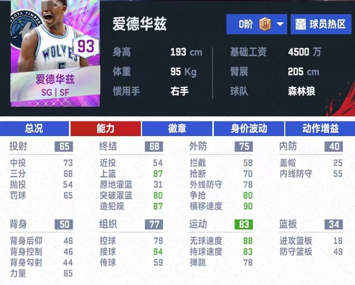 他的基础工资4500万和综合评分高达93分,作为一个拥有高效果的球员还是比较划算的,在技术属性方面,爱德华兹最为出色的是他的接球能力,该项数值高达94分,是其所有属性中的最高值,除此之外他在其他技术属性上的表现虽然均衡但是没有什么突出的地方,大多数属性分数保持在90分以下,只有横移速度一项勉强到了90分的标准线。
