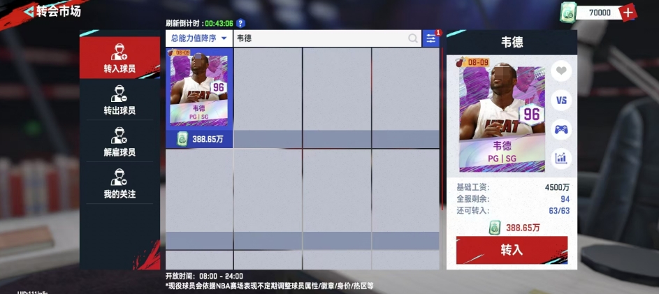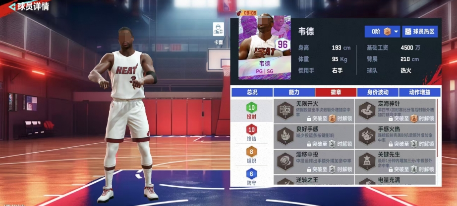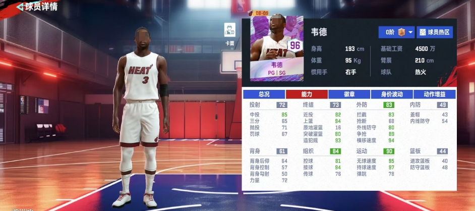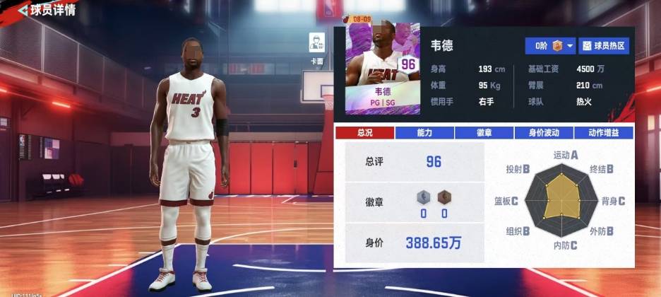 韦德作为一名评分高达96的球员,在运动品质上直接达到A级标准,他的基础工资需求为4500万,身价更是达到了388.65万,尽管价格不菲,但他是新手时期较易获取的球员之一,这得益于他是游戏的代言人,使得玩家在新手阶段通过参与活动就能获得他,在个人属性方面,无论是持球速度还是无球速度,韦德都展现出了超过90的数值。