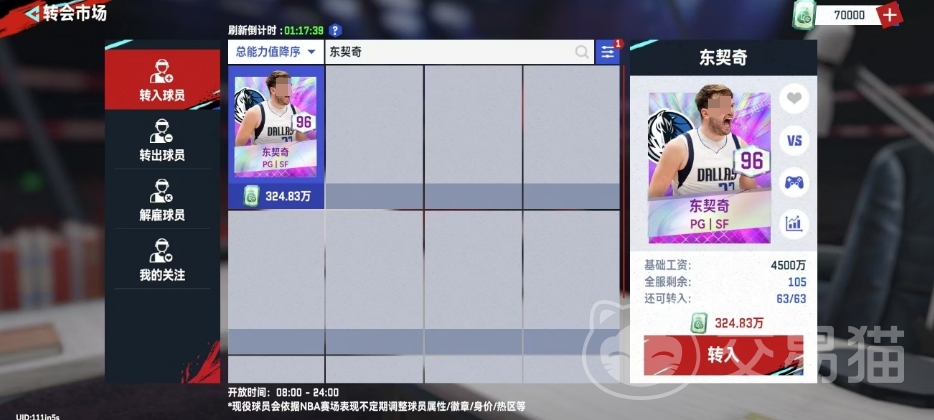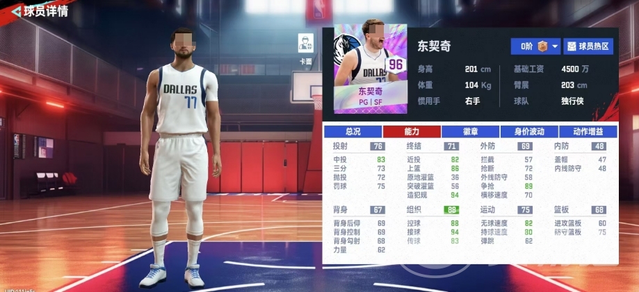 尽管他在游戏中的基础工资相对较高,达到4500万,这一数字反映出他一定有着不错的基础属性,高达96分的总评分还是比较推荐大家使用这个球员的,在紫色球员等级中,东契奇的身价属于中等水平,约为324.83万,这使他成为一位性价比相当高的角色,在基础属性方面,东契奇的投球能力尤为突出,达到94的高数值。