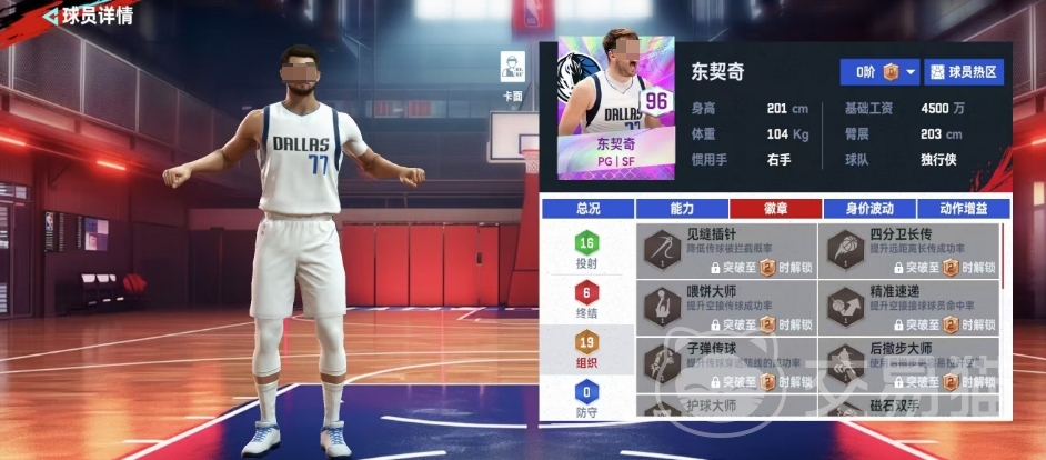而其他属性虽然未达到90,但均衡的表现令他在比赛中可以胜任多个位置,特别是当比赛进入罚球阶段时,东契奇的投篮准确性能够为球队带来稳定的得分机会。东契奇所携带的徽章效果中,见缝插针徽章降低了他传球被拦截的概率,精准速递徽章则提升了他空接传球时队友的命中率,这两个徽章共同作用,使得东契奇在组织进攻时更加高效且难以防守,后撤步大师徽章则为东契奇在使用后撤步时提供了更多的空间创造能力。