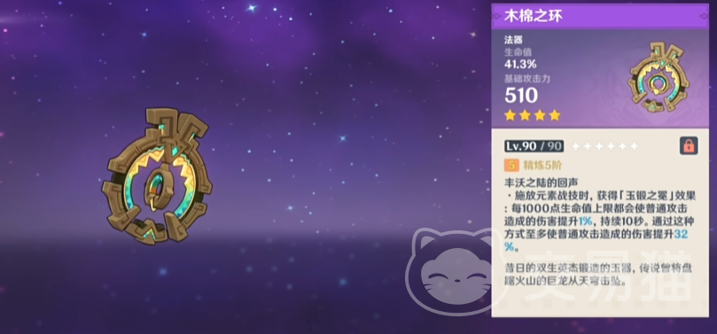 木棉之环,主词条是41.3%的血量,特效用战技获得特殊效果,携带者如果有3.2万血可以获得最多32%的普攻增伤,持续10秒。这个效果完美契合新版本的几个角色,比如说纳塔鲨、鲨鱼妹、玛拉妮。如果不打算抽玛拉妮专武的话用这个挺不错的。