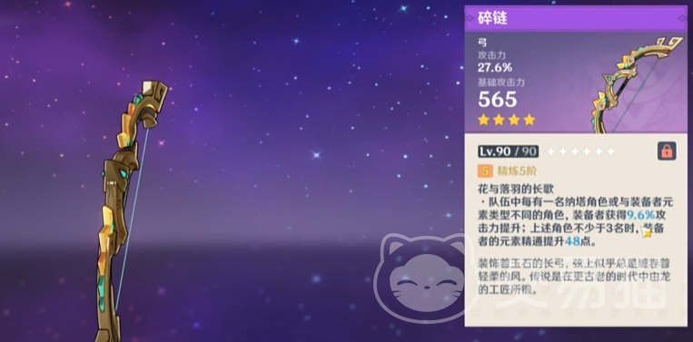 碎链,高白值低攻击力词条,特效是每有1个纳塔角色或者装备者不同元素的角色时,可以给到装备者攻击加成,最多3层也就是28.8的攻击,同时满3层有多48点精通。甘雨、达达利亚都挺适合。