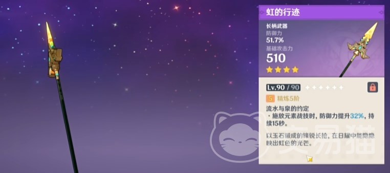 虹的行迹,90级主词条可以加51.7%的超高防御,特效使用战技加防御,目前游戏里缺少输出向的防御力长枪角色,新4星“卡齐娜”和老4星“云堇”算是比较合适的,云堇可以充能加双方词条的部位,然后武器用这个带防御的。