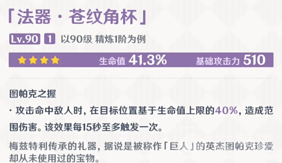 苍纹角杯,免费获取,给需要生命值的输出角色就挺不错,像是龙王、心海、玛拉妮,但也不是最优选,算是下位选择。所以给没有很好4星5星武器的新人拿来过渡是蛮不错的。至此原神5.0新武器就介绍完毕了,这里只是初步的给出一些建议,关于新武器更为明细的运用还有待进一步开发。