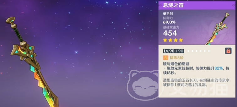 息燧之笛,69%的防御力主词条,特效是在战技使用后可以获得32%的防御加成,持续15秒。单手剑角色中可以吃到防御加成的有阿贝多、千织,但都不是这两位的最优选择。