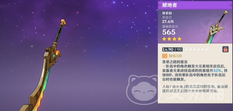 撼地者,很强,有565的攻击白值,外加27.6%的攻击力加成,特效在队友触发火元素相关反应后提升装备者32%的战技伤害,持续8秒,即便是在后台也能触发,也就是主C副C都能用。比较推荐给娜维娅(绑定香菱)主打战技伤害。