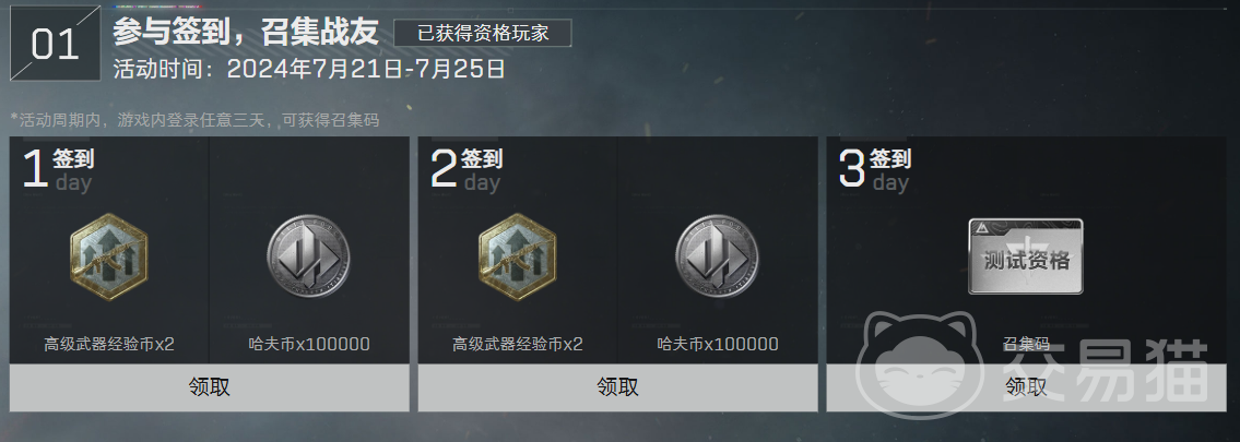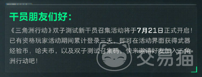 这一次召集活动的具体时间为7月21日至27月25日,是当时的双子测试来的,目前已经过期了,在活动期间,玩家可以通过每日签到来获取各类奖励。首次签到即可获得高级武器经验币和大量的哈夫币,而在连续签到两天后,将会解锁更为珍贵的测试资格——召集码。这份召集码不仅能够用于分享测试资格,还能引导你的朋友一同进入三角洲行动的世界。