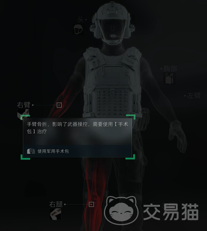 而双腿和双臂可能出现骨折。手臂骨折会影响稳定控制武器后坐力,而腿部骨折则会大幅降低移动速度。即便这些异常状态没有持续降低健康值,也需要尽快使用手术包修复。