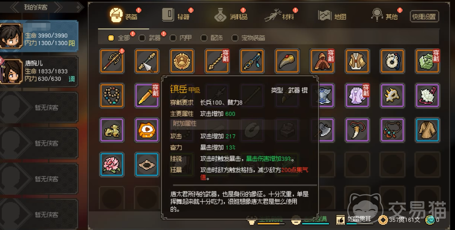 大侠立志传镇岳应该如何获得呢?想必是不少小伙伴们疑惑的地方了,镇岳作为游戏中一个金色级别的棍法武器,能够提升基础的攻击倍率,并且有着最高的暴击加成,本期小编就给大家带来了大侠立志传镇岳的获得攻略供大家参考,希望本期内容可以帮助到各位对此感兴趣的小伙伴们。