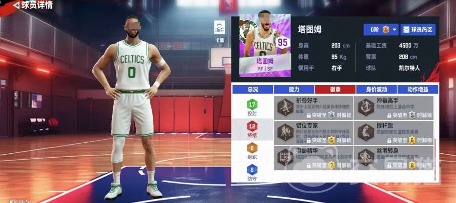 从评分和身价的角度来看,他的性价比相当高,塔图姆的总评分达到了95分,而他的身价大约在240.00万左右,不过值得注意的是,随着游戏进程的推进,这个身价有可能会上涨,他的基础工资为4500万,考虑到他的能力其实这个价格还是相对来说比较合理的,在身体素质方面,塔图姆拥有203cm的身高和208cm的臂展,这两个数据都为他带来了一定的优势。