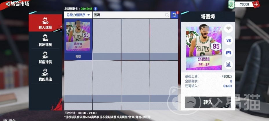此外他的拦截能力也相当不错,达到了80分,争抢能力则有86分,横移速度方面,他拥有87的数值,这意味着他在抢球方面有着很大的潜力,值得玩家培养,然而,塔图姆的弱点在于内线防守,他在盖帽和内线防守方面的表现较为一般,因此建议玩家在使用他时避免让他承担内线防守任务。