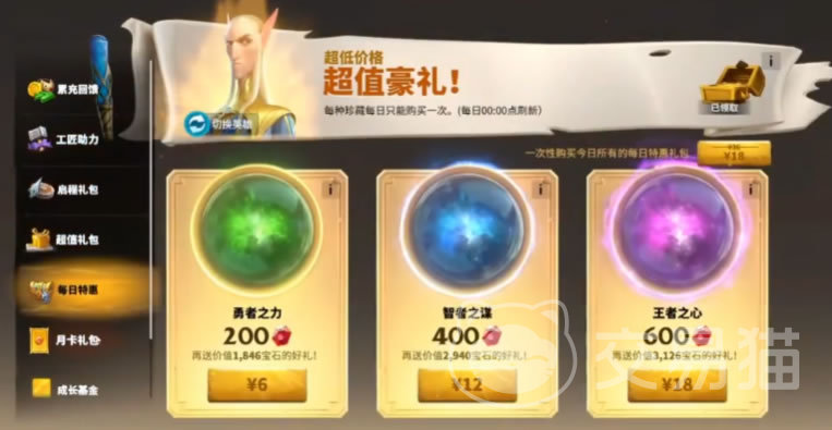 每日特惠也是一个相当具有价值的购买内容,每天18元的付费,可以一次性拿到大量超值资源,对于实力提升很有帮助。