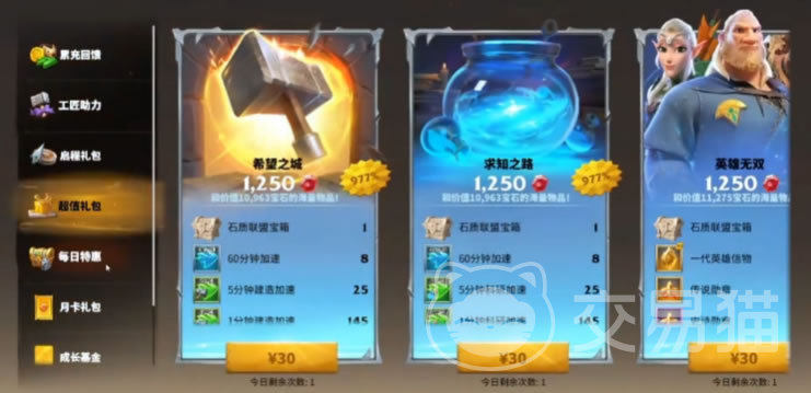 游戏中有很多弹出礼包,它的性价比是非常高的。弹出礼包一般是最具价值的,不仅有着大量的稀有道具资源内容,还含有不少红宝石,红宝石之后能够用于购买VIP等级积分。弹出礼包随着玩家的升级和功能开启会不断激活,但它是一个限时购买的项目,一般在1小时如果没有购买就会消失。