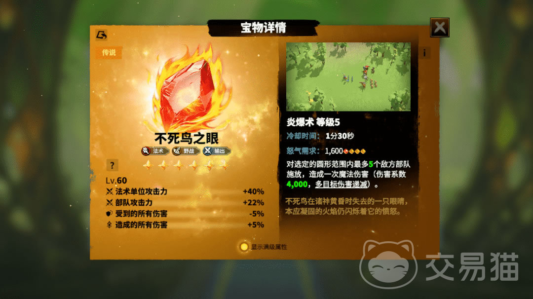 莉莉娅的觉醒需要将其4个技能都全部升满,且英雄等级达到40级以上才能进行。而她的一技能复仇怒火本身就威力巨大,根据等级不同能造成600-1200点爆炸伤害,同时攻击范围内两名敌军;并产生持续的燃烧效果在5秒内继续杀伤,随着技能的增加,触发燃烧的概率从10%也会提升到50%。所以在宝物选择上推荐“不死鸟之眼”,同样属于火系魔法,在范围内可以同时对多达5个部队产生伤害,且伤害系数极高。