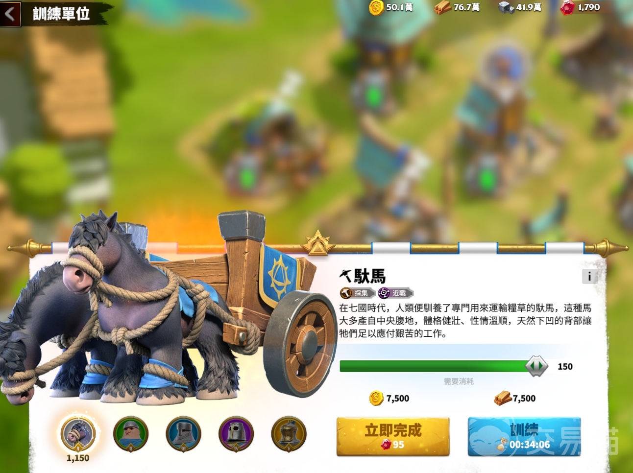 若是玩家们要前往资源点进行采集,也需要带上驮马兵种才能将资源运送回主城,只不过在这样的情况下,单次资源运输能力不光与驮马兵种的数量有关,也与该资源的等级挂钩,等级越高的资源点能产出的资源越多,所能运送的资源数量也就越高,但不得超过周资源运输上限。