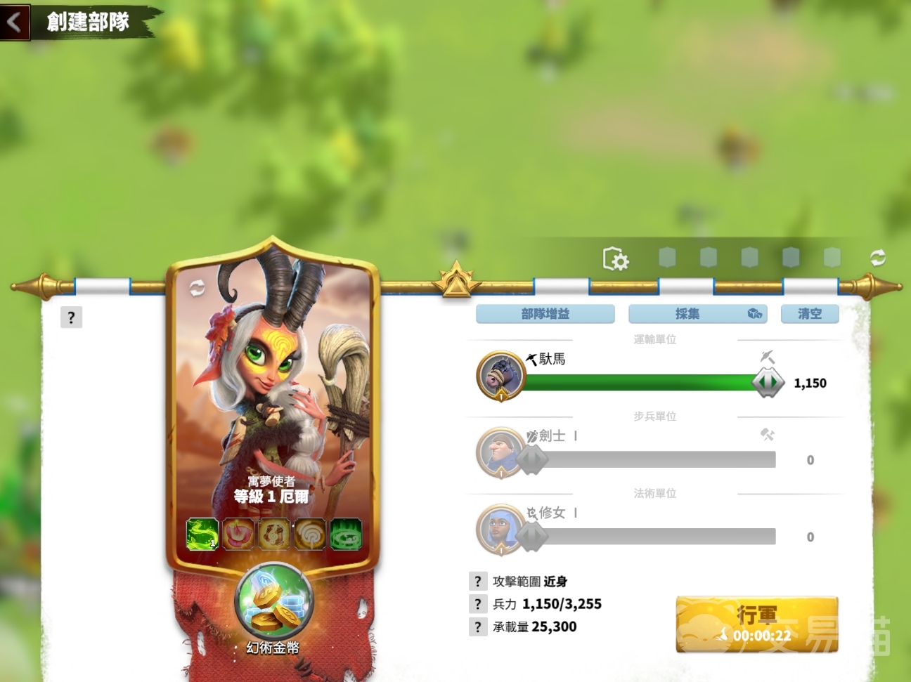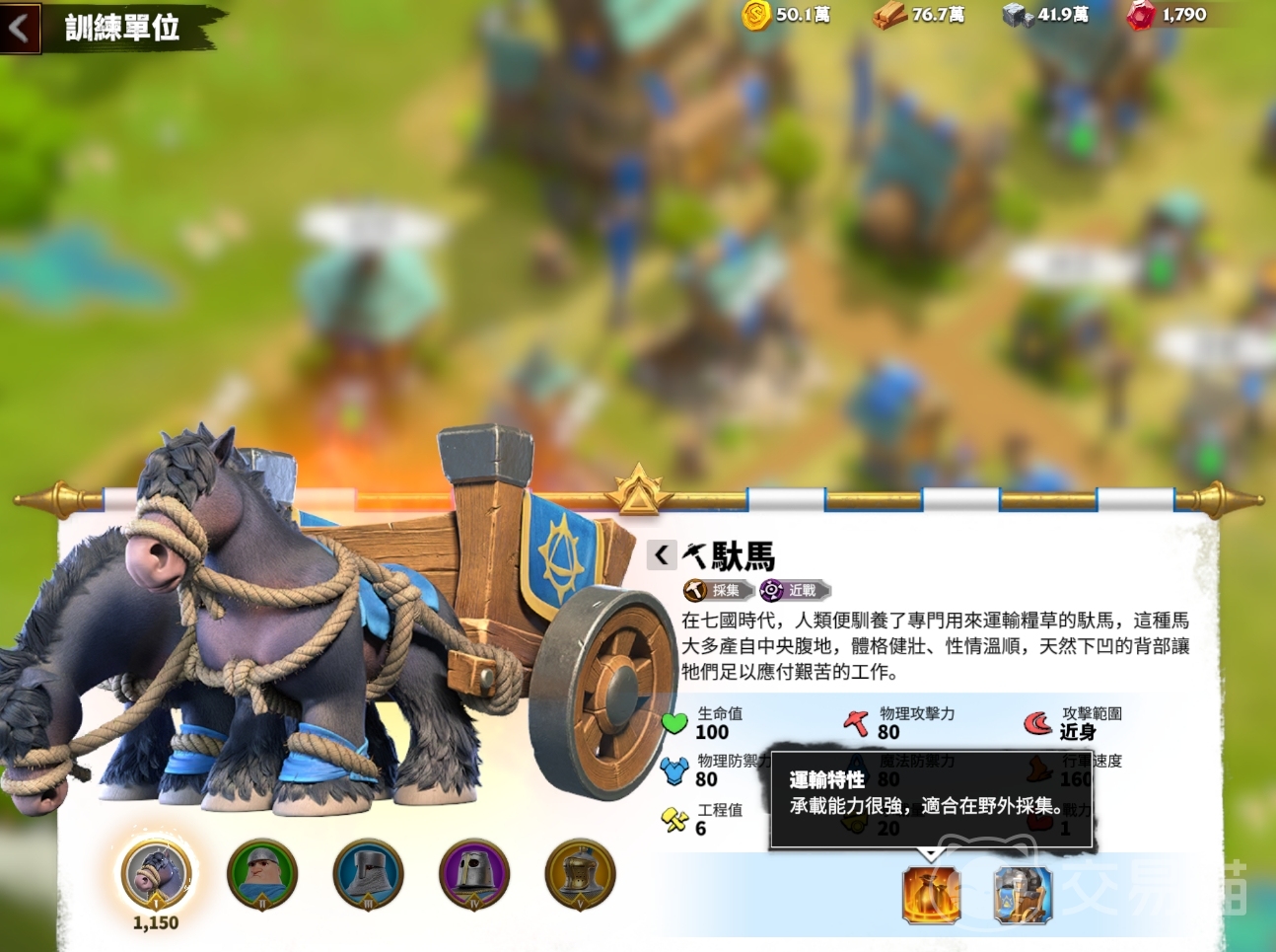 当玩家们需要进行资源运输时,可在创建队伍界面选择能为运输或骑兵兵种带来加成的英雄,让它带领驮马兵种来完成运输任务。游戏中的运输能力与队伍中所携带的驮马数量有关,若是驮马带得比较多,那么队伍的单次资源运输能力也将得到提升,这也使得驮马兵种是每位玩家必招募的兵种之一。