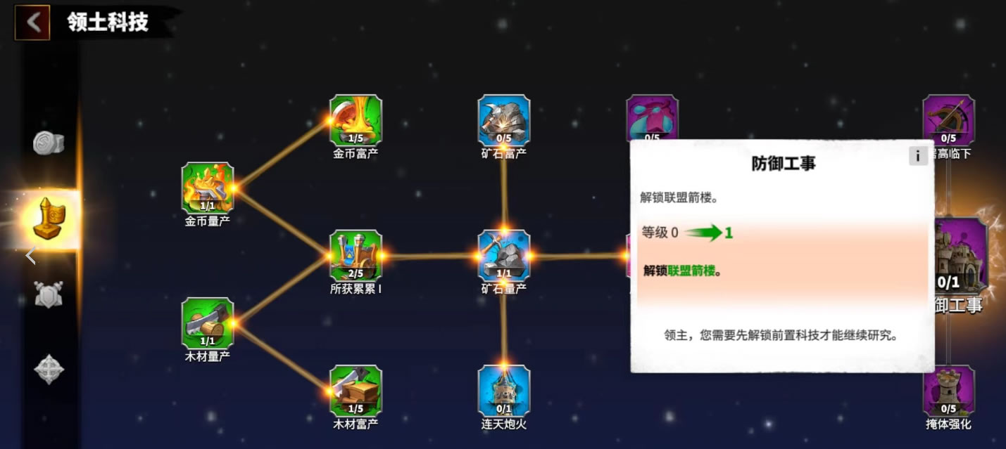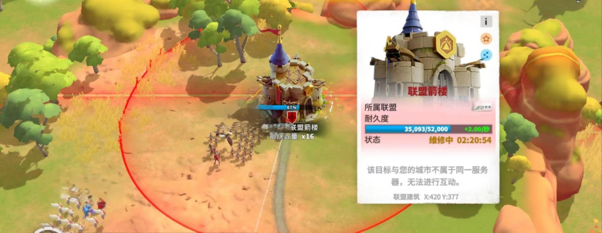 联盟想要造出箭楼,就需要升级“防御工事”这个联盟科技,激活后便能在联盟领土上建造,联盟内最多可以建造6个箭楼实现防御效果。而箭楼是有一个射程范围的,这个范围内不允许重复建设新的箭楼;也就是说一块土地只允许一个箭楼进行守卫,否则叠加六个箭楼的攻击效果就过于强大,失去了攻防上平衡了。