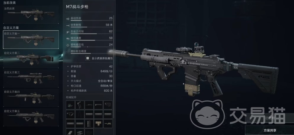 至于三角洲行动m7其它配件,推荐幻影后握把,416轻型枪托,增高架、一倍镜、镭射,5个护目片都采用加后坐力的。如果觉得后坐力已经加得差不多了,但据枪减得有点多,后面的子弹打出去有点抖,就可以将部分护目片改成加据枪的。