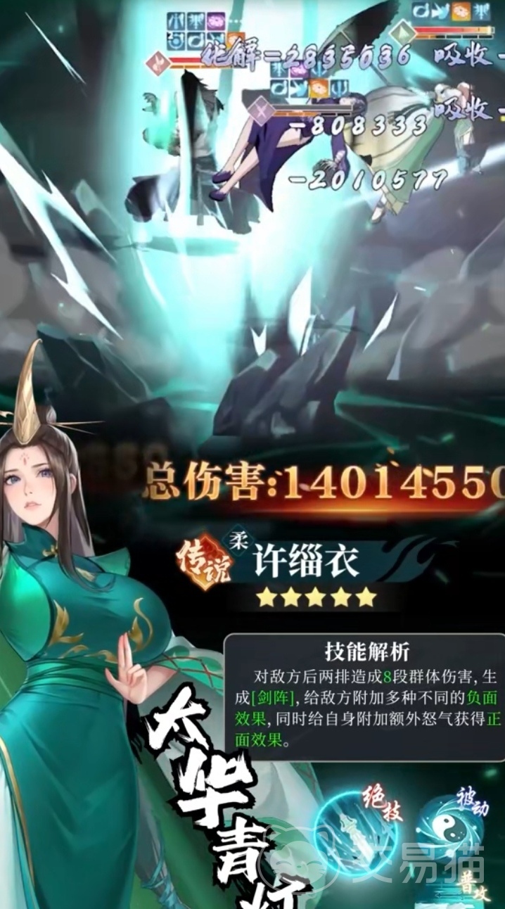 他的绝技太华青灯,可以对敌方阵容前两排的角色发动八段的攻击,并且在每个单位中都会造成124%的内功伤害,并且还有100%的概率,可以生成一个剑阵,剑阵分为三个不同的等级,在使用时可以很好的降低对方的攻击力,如果有两个一级剑阵,则会升级到二级剑阵,同理,如果有两个二级剑阵,则会升级成为三级剑阵水月。