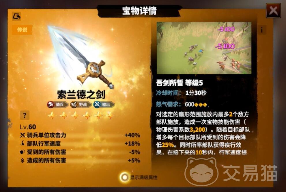 索兰德之剑是一件骑兵才能够使用的宝物,在有着非常强力的攻击的同时,这件装备还增加了珍贵的移动属性。这就使得装备这件宝物的英雄非常适合带队去扫田,不只是装备本身增加移速,技能的特效甚至能添加疾行效果,真正体现了什么是兵贵神速。