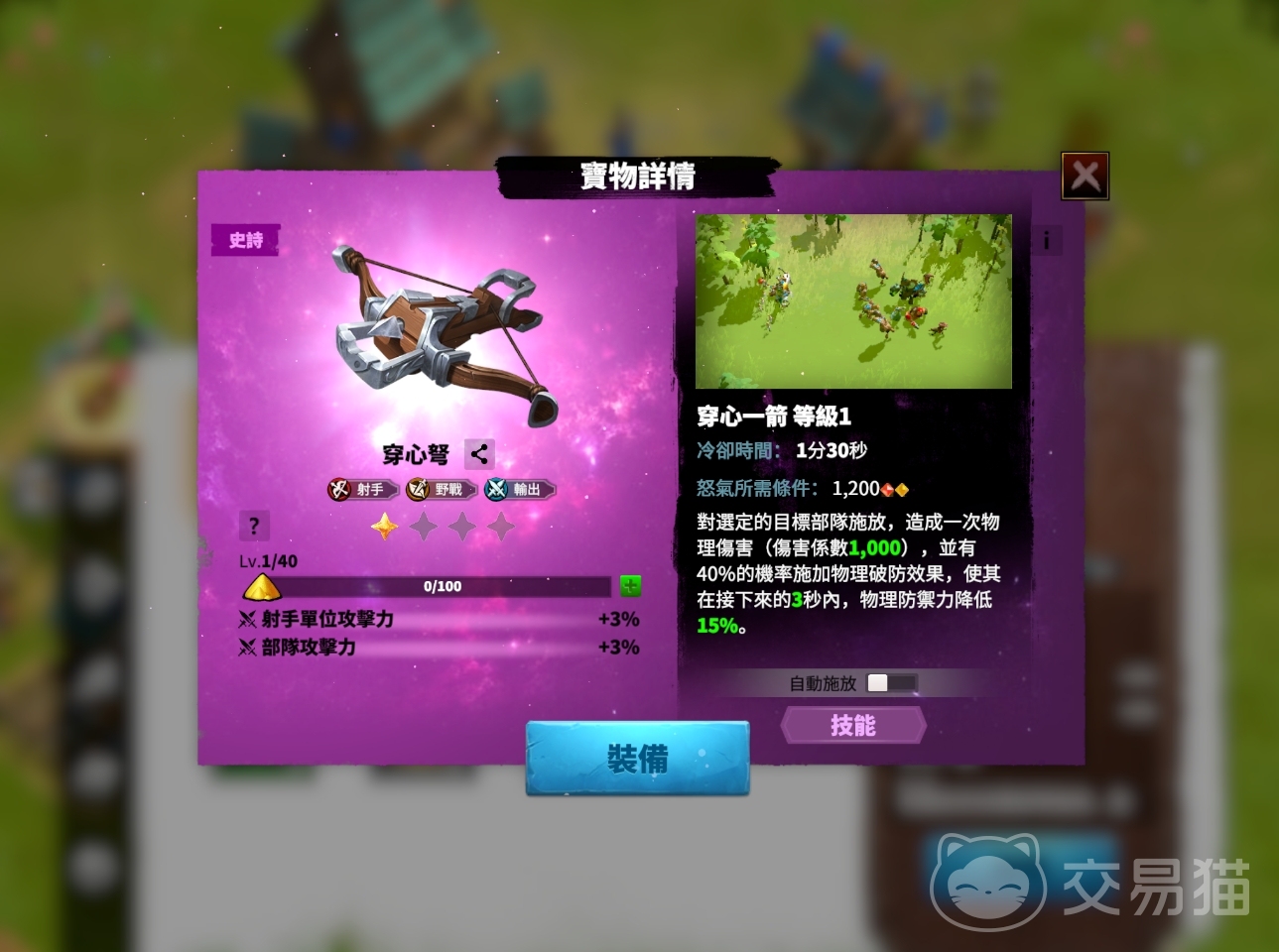 宝物在本质上也有着与英雄一样的自身特性,在英雄装配后相同的特性可直接叠加,例如穿心弩在特性上就很适合刚刚所提到的克岚西,并且克岚西装备后在效果上要比给它装配一个不具备相同buff特性的金武器要好,而这就是相同buff带来的功效,所以人们一定要根据英雄和宝物的特性来进行搭配,尽可能触发相同buff。