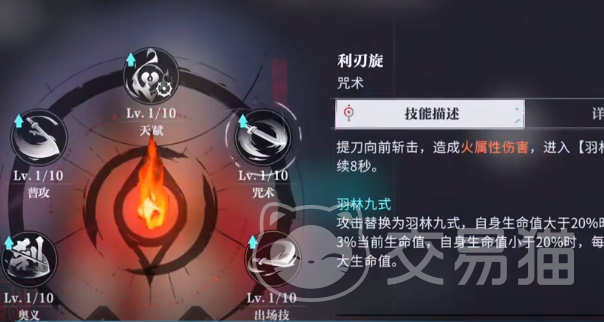 真金烈火:属于一个被动技能,进入到【羽林九式】状态之后马上就可以有效提升暴击伤害。