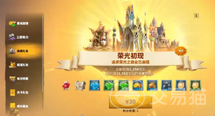在初期时,另一个值得投资的项目是启程礼包。不仅立刻获得1250的宝石,又可以得到价值高达2万多的资源与道具奖励,不过这个礼包是一次性的助力,只能购买一次哦!