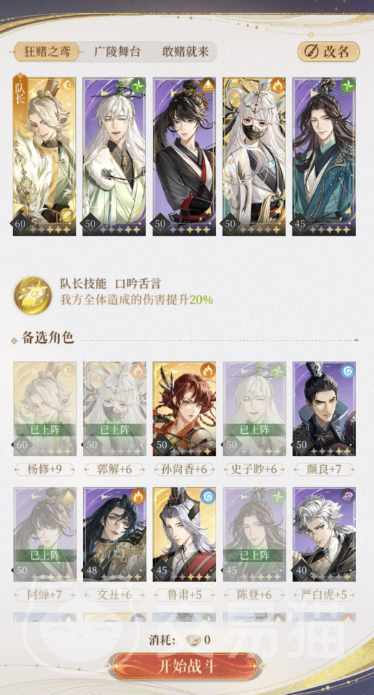 郭解50+6,杨修60+9,陈登45+6,阿蝉50+7,狮子喵50+6。开始需要陈登初始+2,卡随大招轴,开局并不一定非要赌双数,但是如果要是能够双数的话就是最好的了,杨修第一发技能近万伤确实比较好打,不过也有开局8000的轻松度过了。