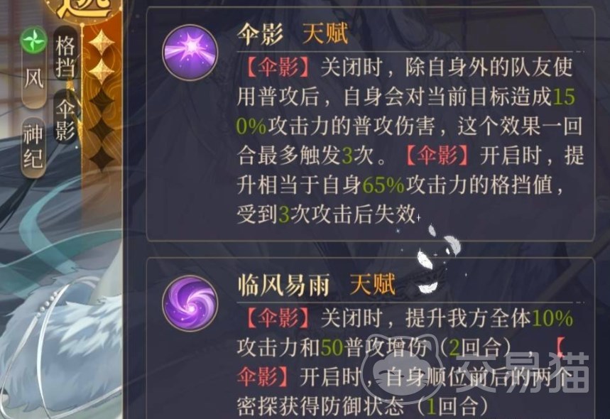张邈的普攻是2段伤害,倍率不低。技能则是队目标造成最高320%倍率的伤害同时获得4回合“伞影”状态,初始是关闭状态,下划防御开启,使用普攻后关闭。关闭的时候队友普攻张邈会追加伤害,单回合最多3此。