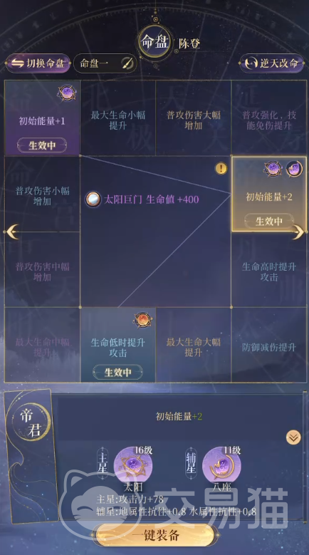 这一阵容的命盘方面,张邈需要初始能量加3、风属性密探强化、道同为谋。诸葛瑾必备常棣、寒霜拂矢,诸葛诞也要带吹火打配合。董奉是队伍的主要奶妈,必备植杏成丛快速囤恢复生命的杏子,还有带随营医者。陈登的主要作用就是开技能,因此必带初始能量加2、紫色的初始能量加1,其余随意。