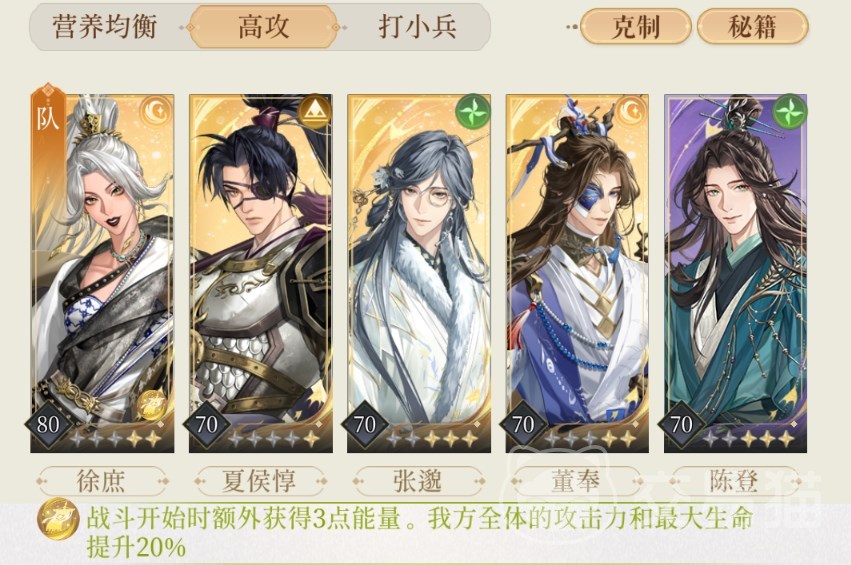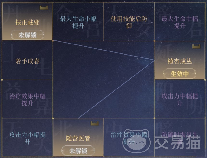 命盘这一块橙色命盘“扶正祛邪”效果提升直接变为回合开始清除全体沉默、麻痹,但冷区4回合。“植杏成丛”,每3此处普攻额外全体回血,同时得到1个杏子。“随营医者”,岐黄或者龙盾密探总数少于等于2,提升全体最大血量和攻击。“着手成春”,下划防御给全体回血。